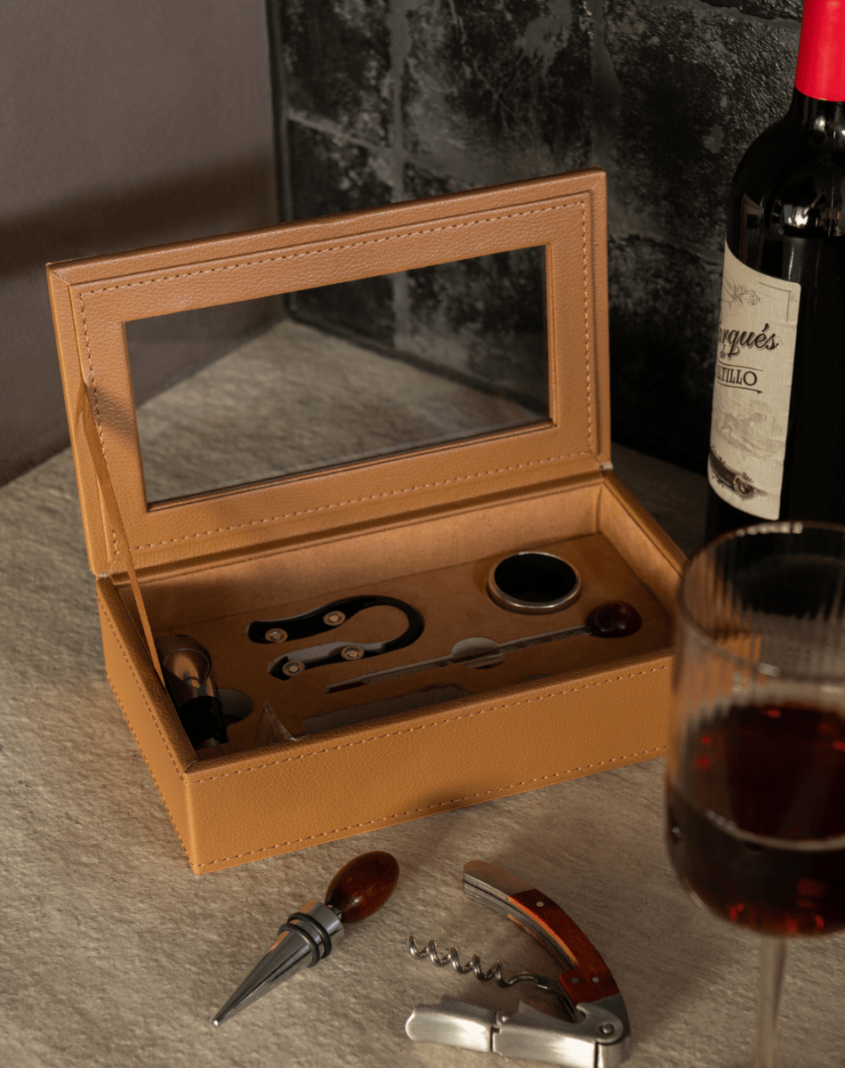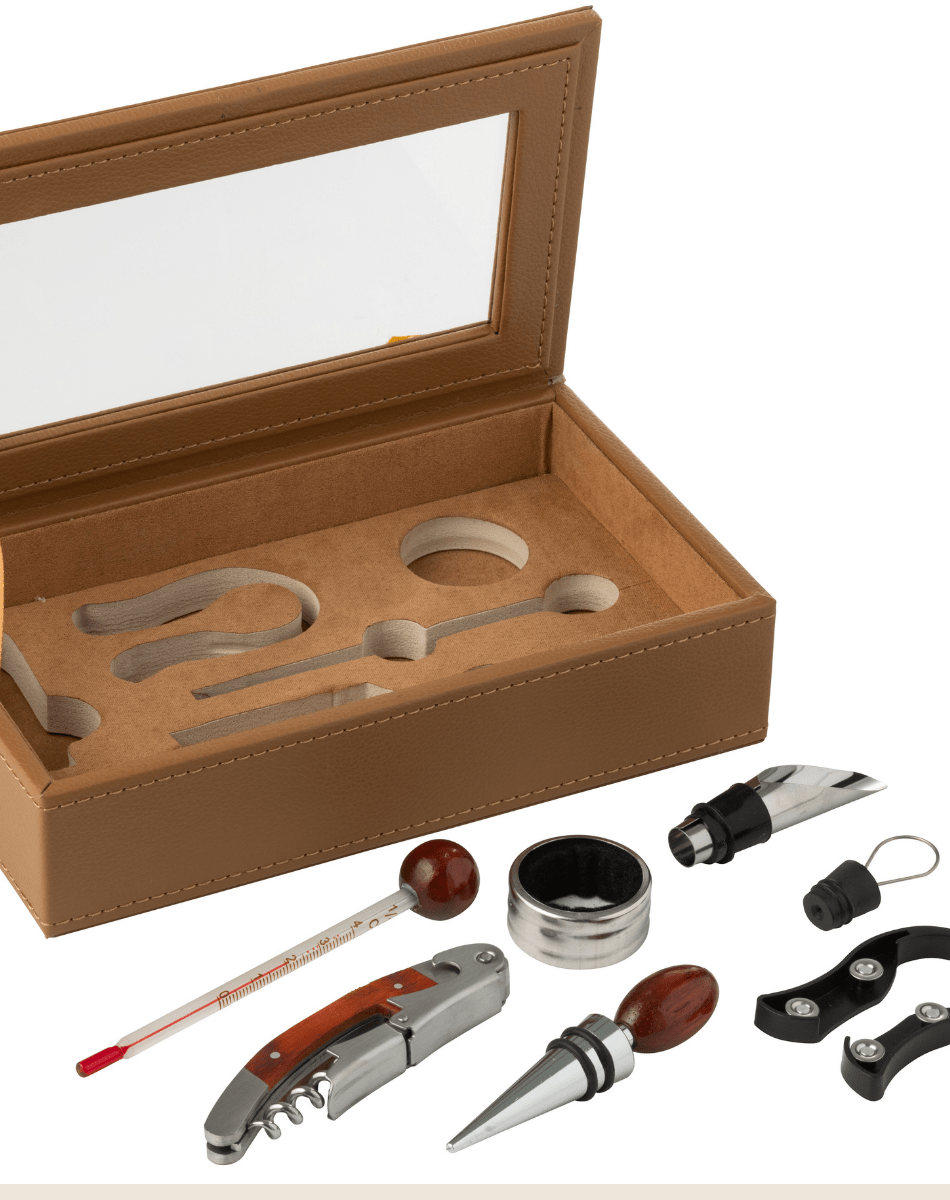 À l’intérieur, elle renferme plusieurs accessoires essentiels pour le service du vin : tire-bouchon, bec verseur, collier anti-goutte et bouchon. Chaque élément trouve sa place dans un écrin soigné, pour une expérience de dégustation complète et raffinée.