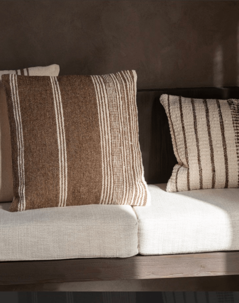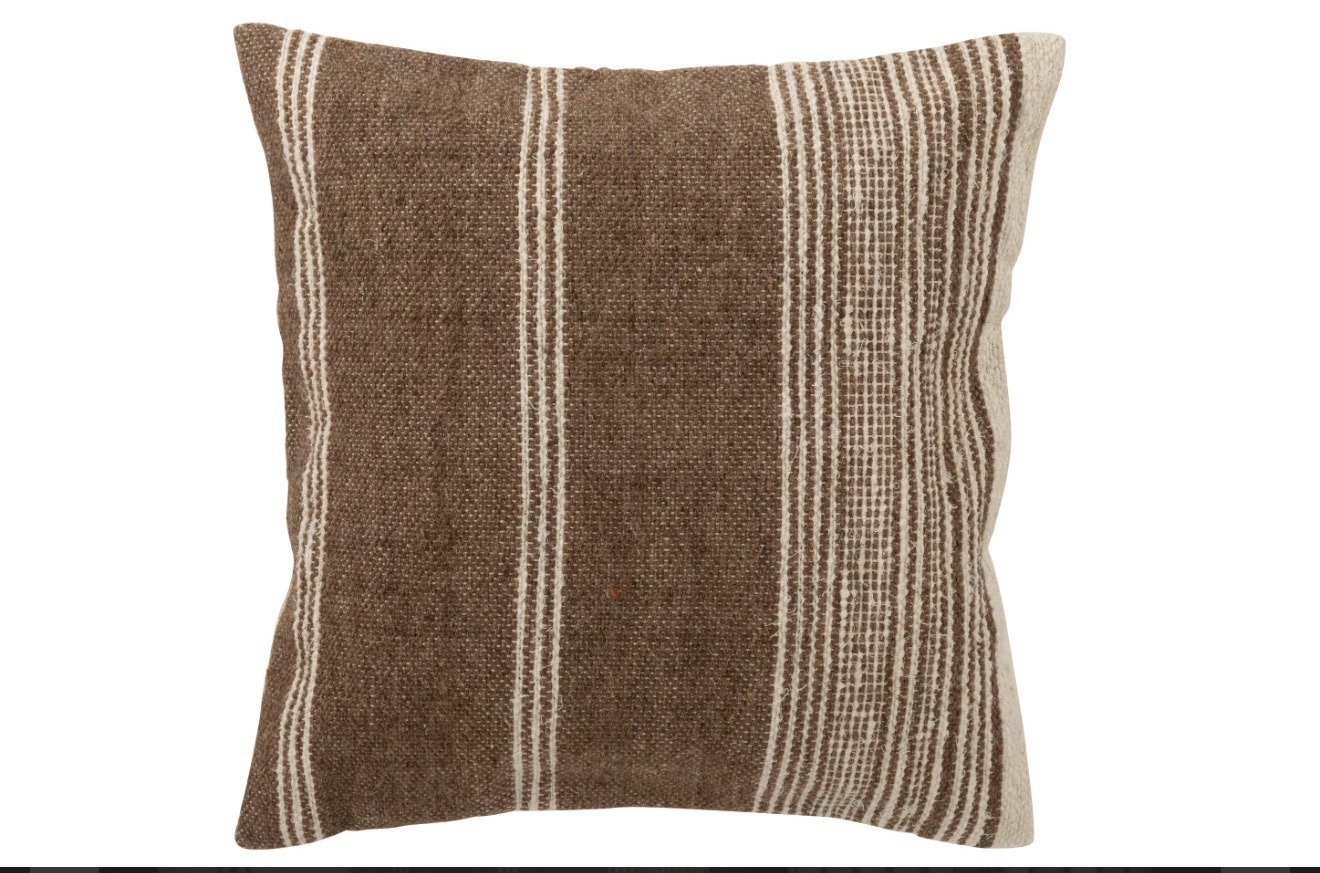 Coussin carré ligné en laine marron foncé & écru