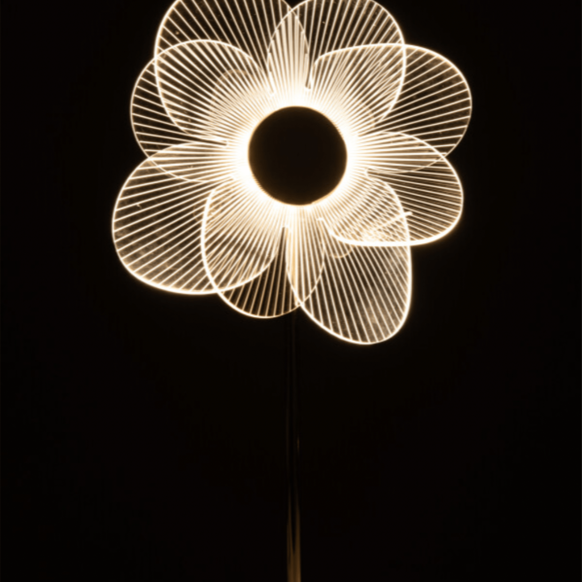 Une fois allumée, cette lampe ne se contente pas d’éclairer : elle projette une aura graphique et apaisante dans la pièce, transformant un simple mur ou une table en une œuvre d’art dynamique. Son design aérien et son cœur sombre contrastent magnifiquement avec la clarté des lignes lumineuses.