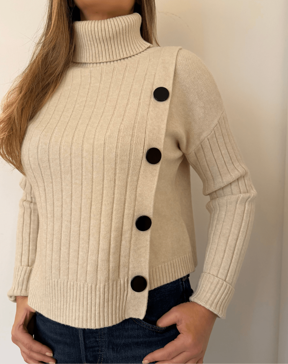 Ce modèle en maille épaisse, doté d’un magnifique col roulé côtelé, se distingue par son détail iconique : une patte boutonnée asymétrique sur l’épaule et le côté, qui apporte immédiatement du style et une touche couture à la silhouette.