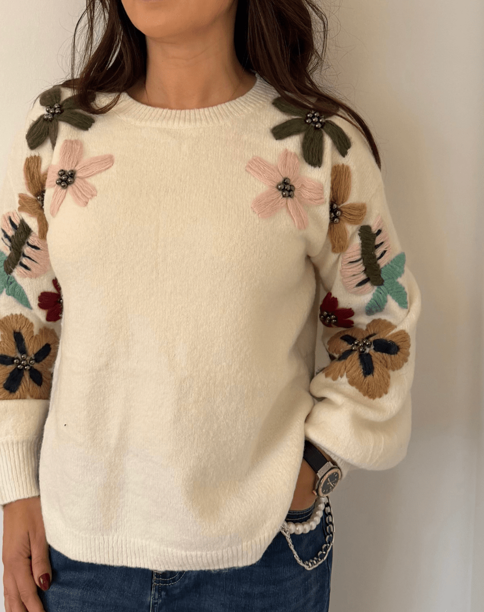 Ce modèle crème séduit par ses manches brodées de fleurs en relief, composées de fils texturés et de petites perles qui ajoutent un charme unique et artisanal.