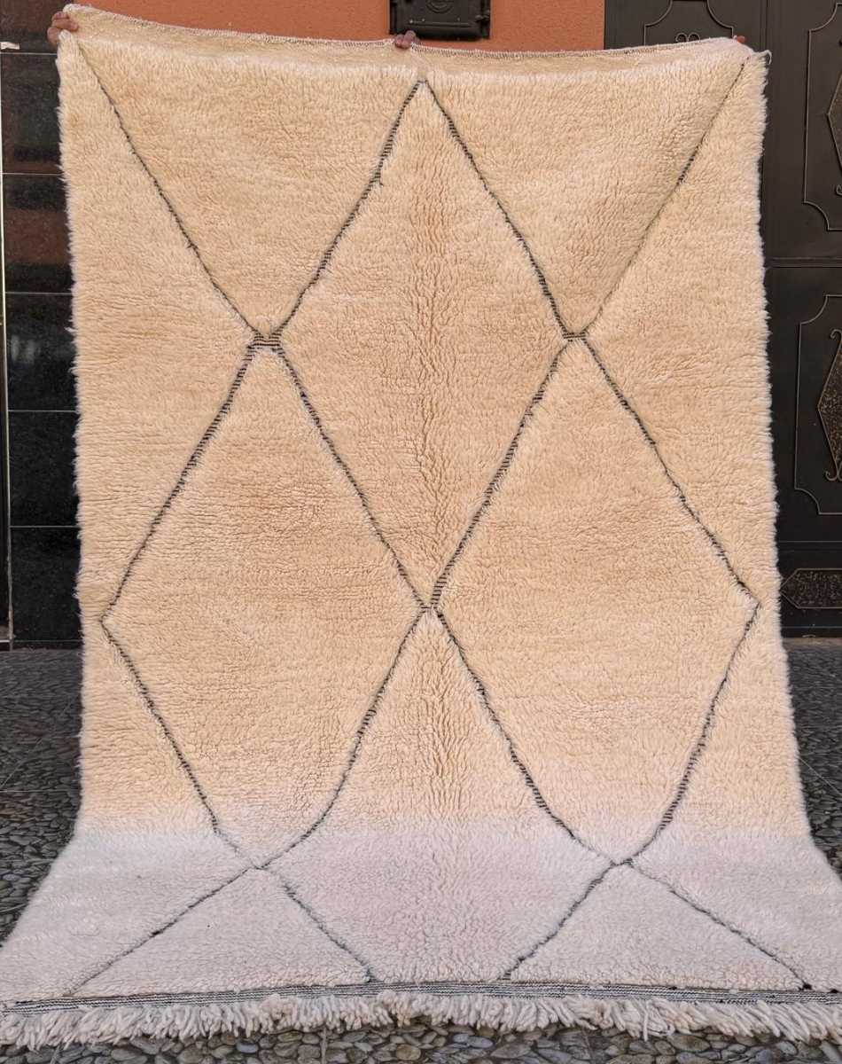 Optez pour l’élégance intemporelle avec ce tapis berbère Beni Ouarain aux grands motifs losanges noirs, tissé à la main dans la pure tradition marocaine. Ce modèle aux dimensions généreuses s’impose comme une pièce maîtresse de votre décoration : il structure l’espace, réchauffe l’ambiance et apporte une touche authentique à n’importe quelle pièce, du salon spacieux à la chambre parentale.