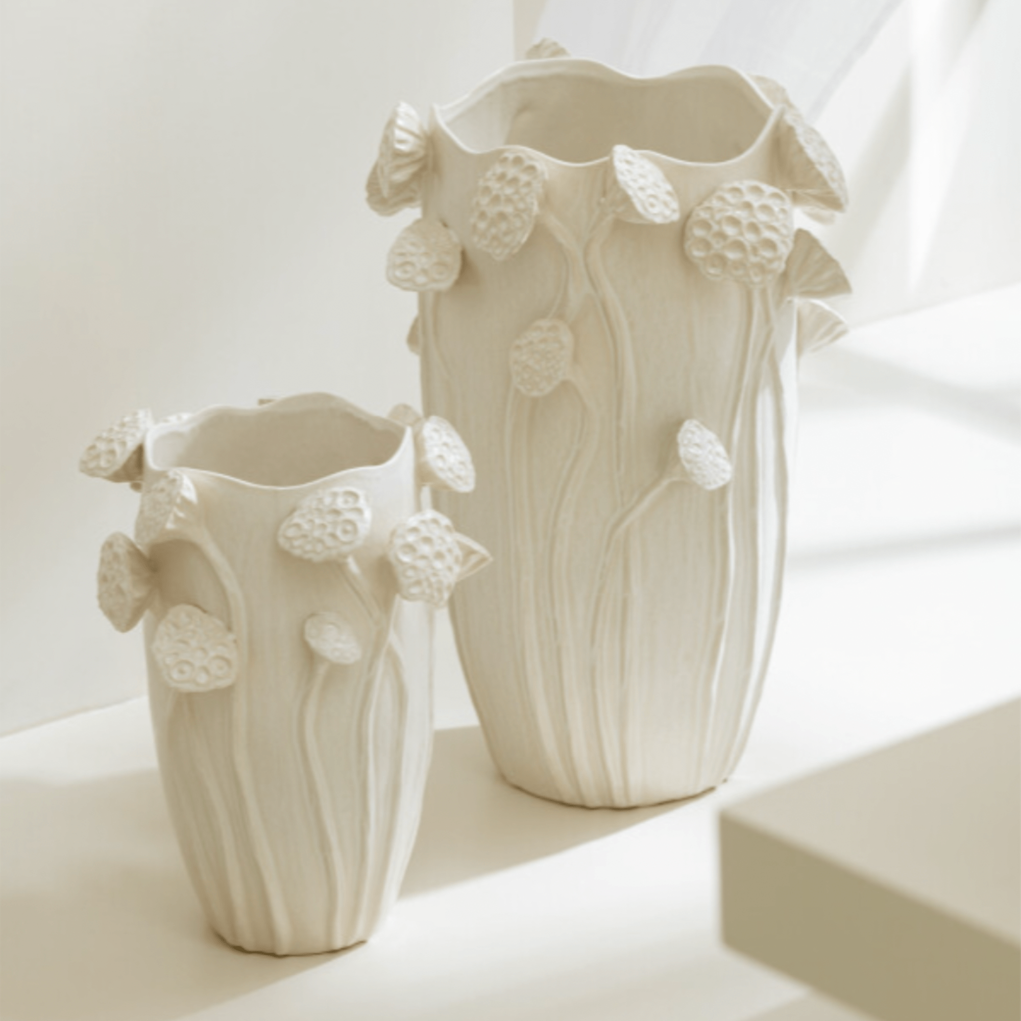 Véritables œuvres d’art, ces vases en céramique texturée célèbrent la beauté brute de la nature. Ornés de reliefs délicats inspirés des capsules de lotus, ils présentent une silhouette organique et des bords irréguliers qui captent la lumière avec douceur.