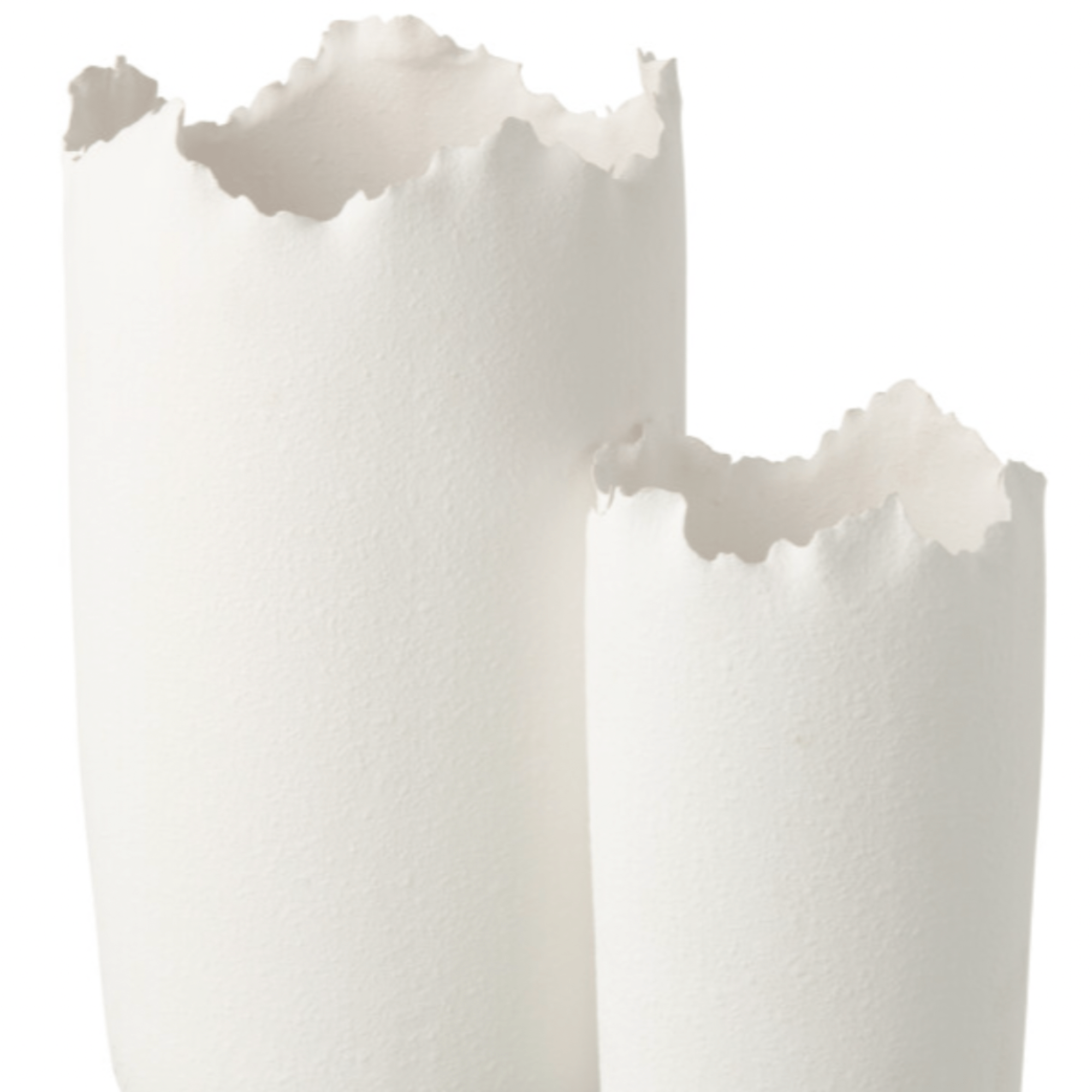 Laissez-vous séduire par la simplicité radicale de ce vase en grès blanc, dont le col irrégulier évoque la délicatesse d’une coquille d’œuf ou d’une écorce naturelle. Sa texture mate et finement granuleuse apporte une dimension minérale et authentique à votre décoration intérieure.