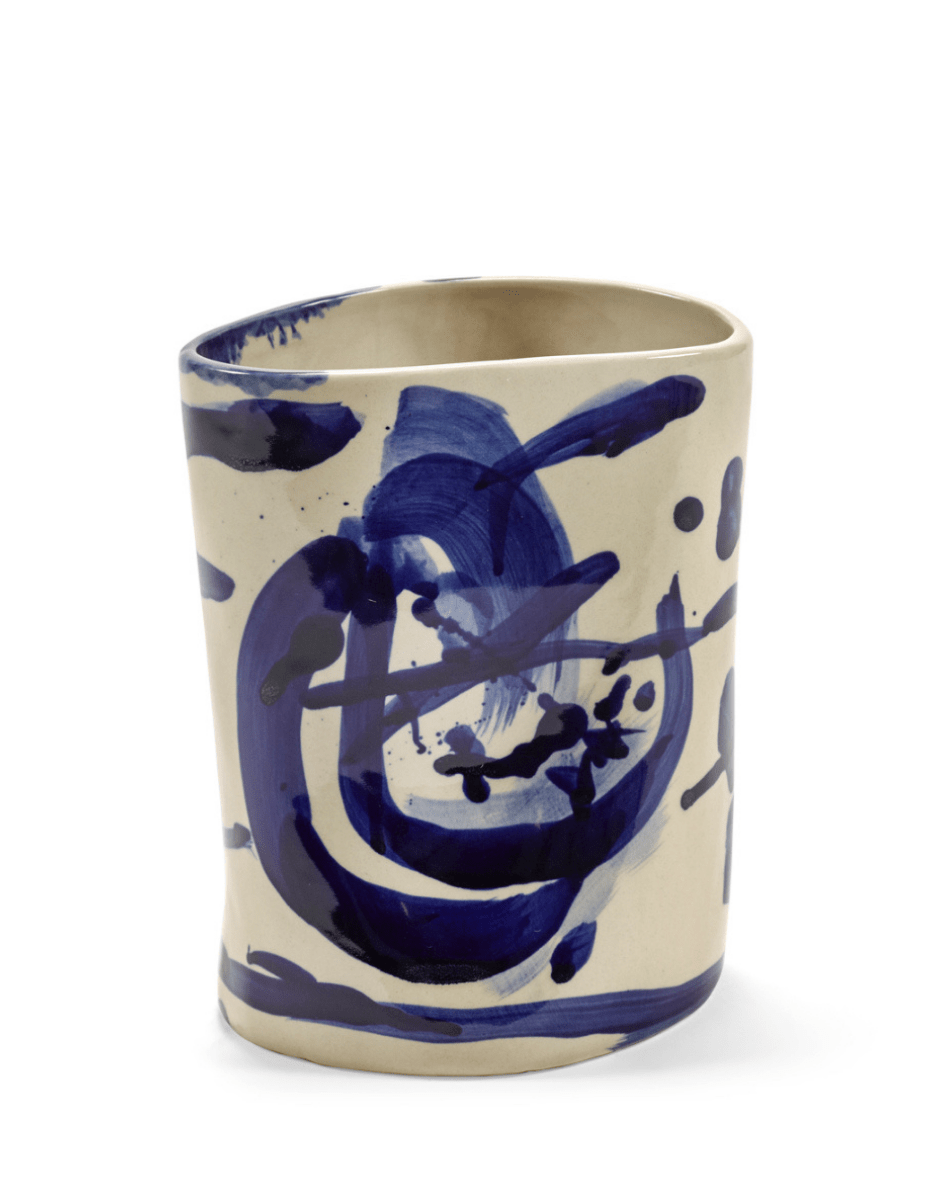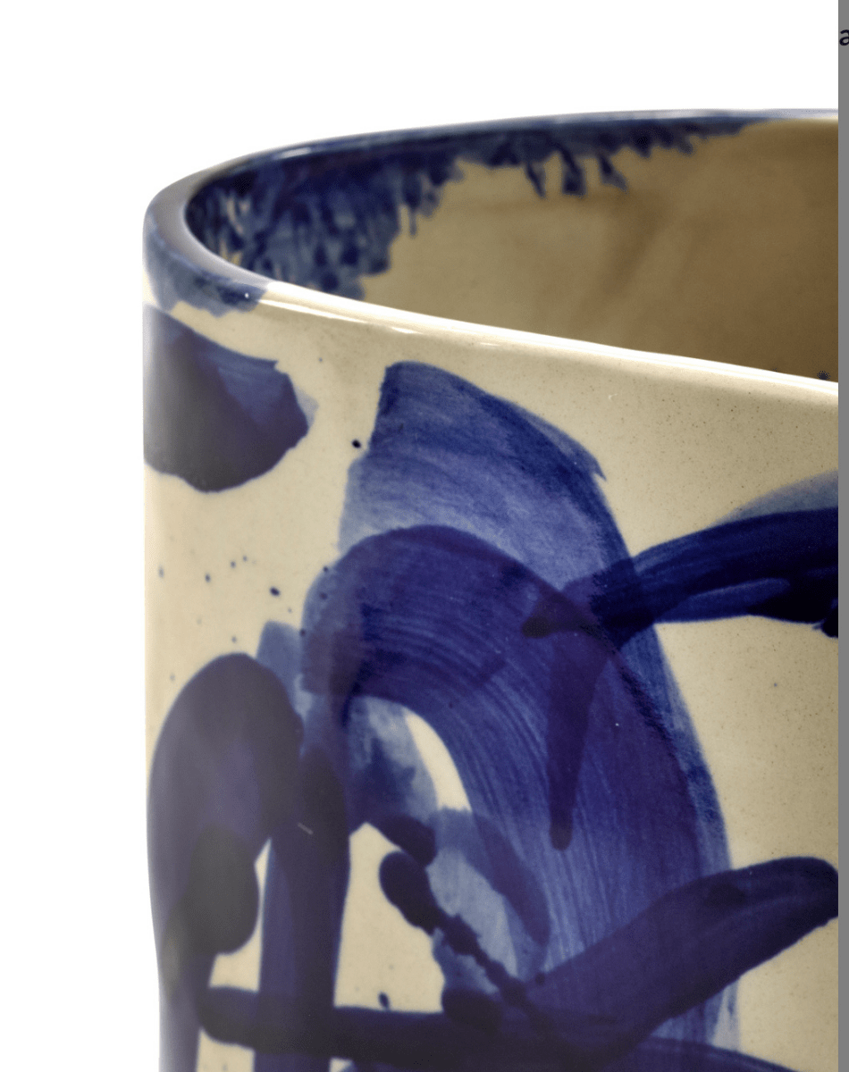 Peint à la main dans des tons délicats de bleu et beige, il s’inspire de la calligraphie orientale, où l’inspiration du moment guide le geste.