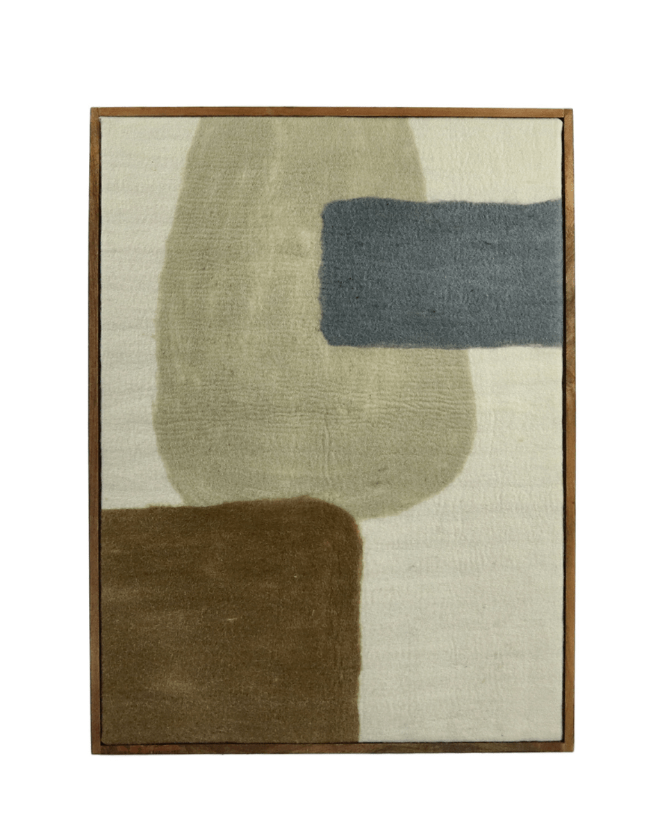 Véritable œuvre murale, la déco Wooly attire immédiatement le regard. À première vue, elle évoque une peinture contemporaine ; en s’approchant, on découvre une composition en laine feutrée, délicatement appliquée sur toile et encadrée de bois de manguier. Une pièce à la fois artistique, texturée et chaleureuse.